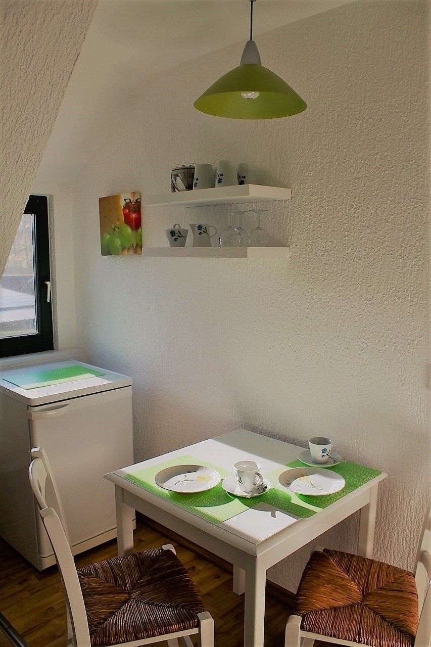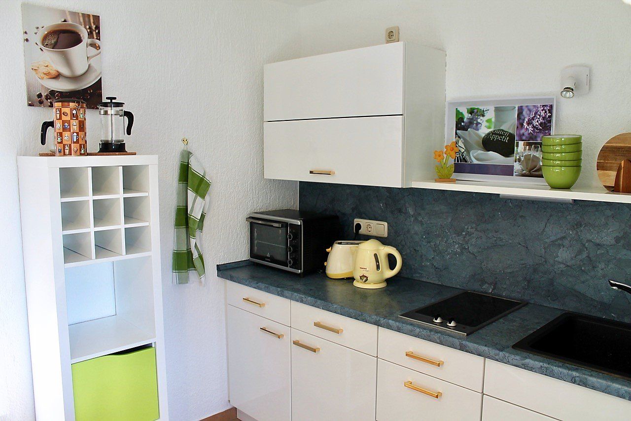Küche mit Geschirrspüler, Kaffeemaschine, Wasserkocher, Backofen, Toaster, Eierkocher, Cerankochfeld,